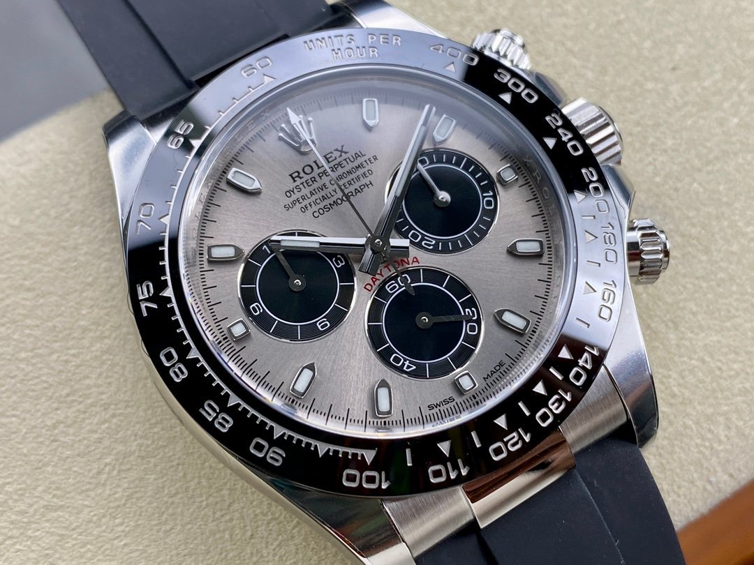 The Rolex Daytona 116519 1:1 Superclone quality with a silver dial and rubber strap. It is a 40mm watch that is made of white gold polished on 904L stainless steel. The dial is silver with black subdials and features Chroma Light lume. The watch is powered by the Rolex calibre 4130 automatic movement. It has a water resistance of 60 meters.
