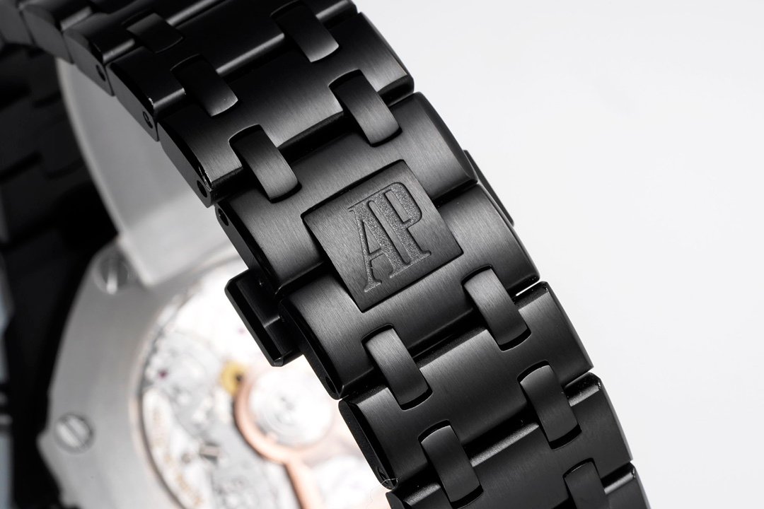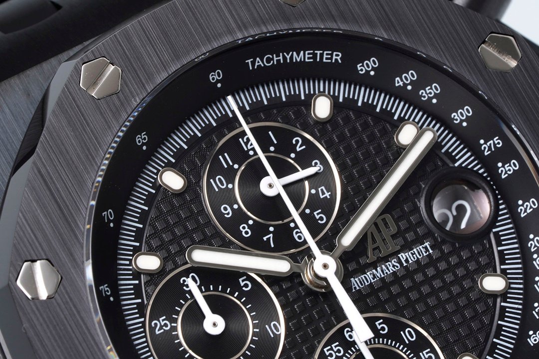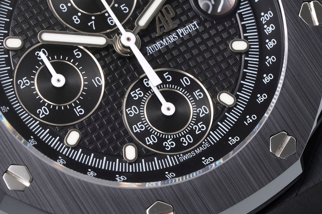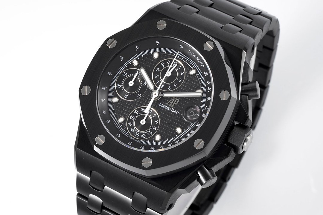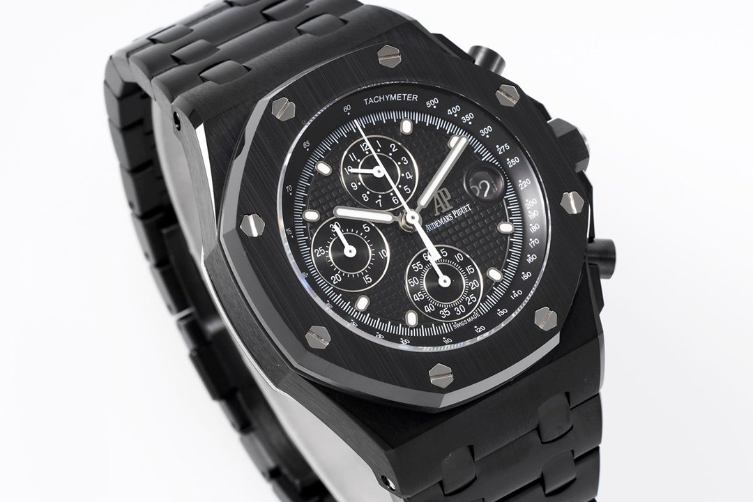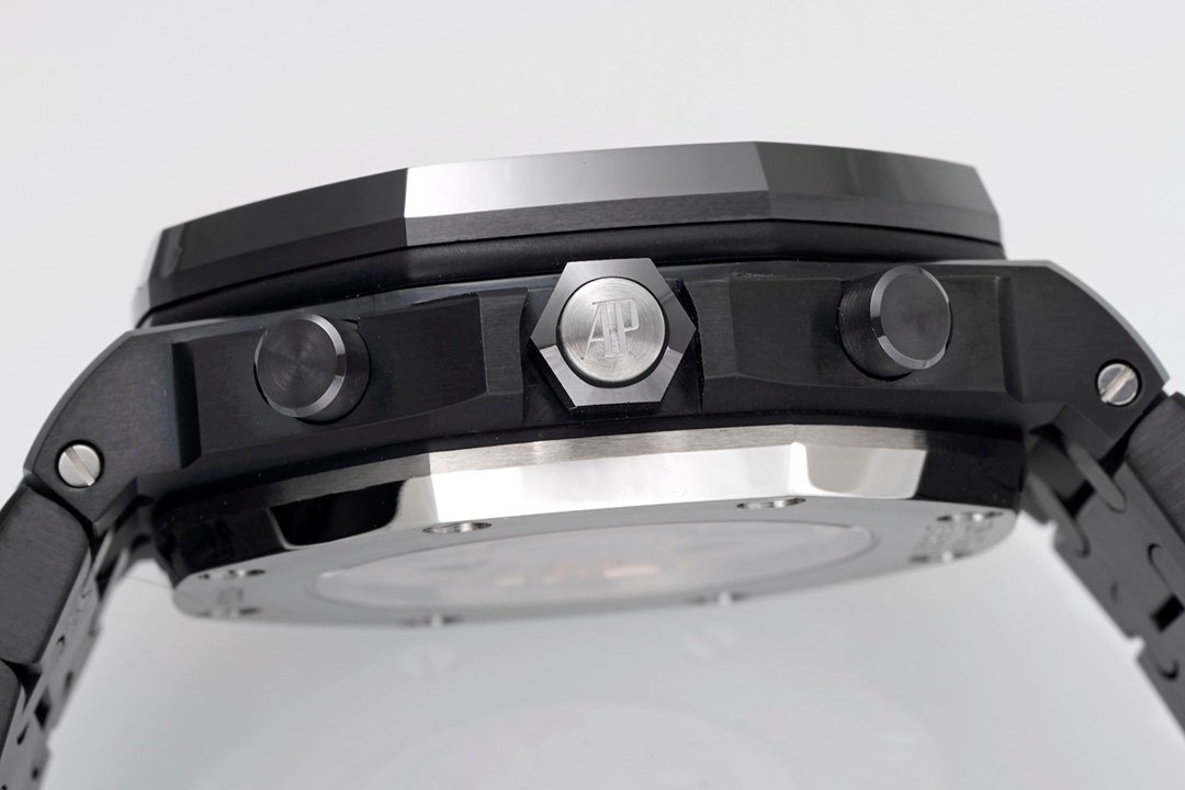 Audemars Piguet Royal Oak Offshore Self Winding Chronograph 26238CE 1:1 Superclone. It is a black ceramic watch with a black dial and a chronograph. It has a black ceramic case and a black ceramic bracelet.